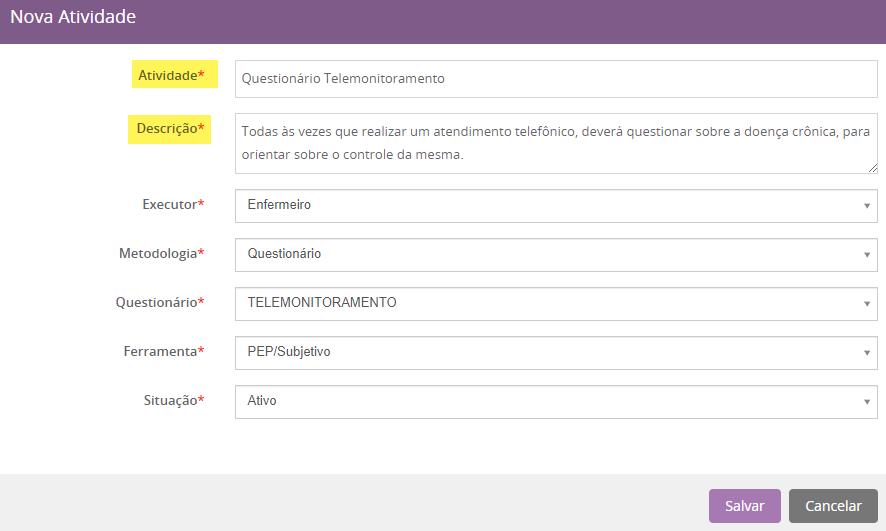 - Metodologia: método que deverá ser empregado ao realizar essa atividade (Consulta/ Orientação/ Questionário).