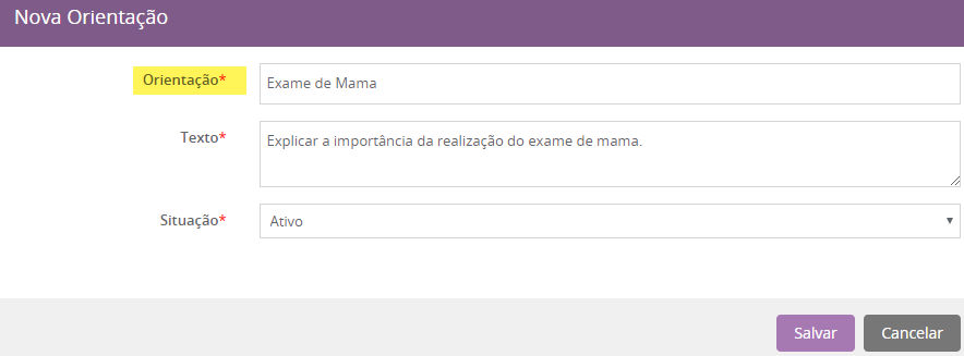 - Questionário/ Orientação : Se selecionar "Questionário" na metodologia, deverá selecionar o questionário para realização dessa atividade. Se selecionar "Orientação" deverá criar Orientação no caminho: Protocolos > Orientações > Nova Orientação