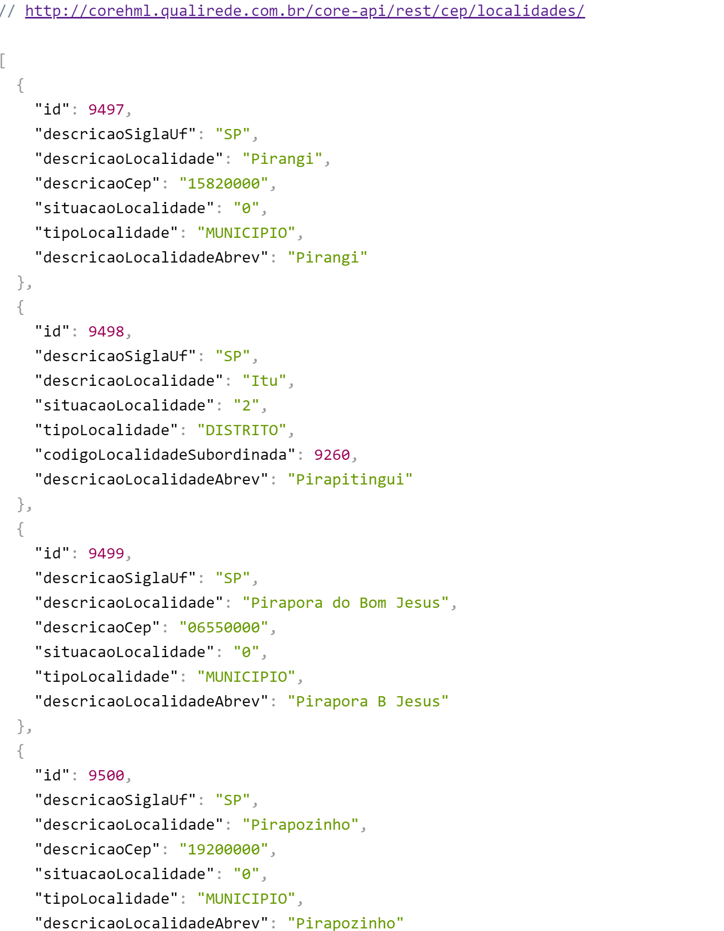 Da mesma forma que os domínios, os cadastros específicos também são disponibilizados via serviço rest. No exemplo de Localidades, o serviço REST retorna da seguinte forma: